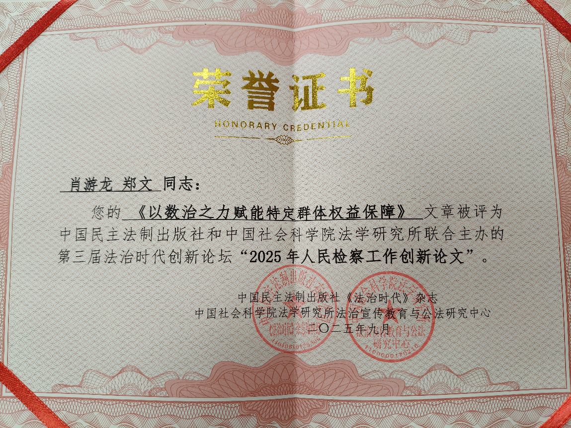 金湖县检察院报送的《以数治之力赋能特定群体权益保障》被评为第三届法治时代创新论坛“2025年人民检察工作创新论文”。
