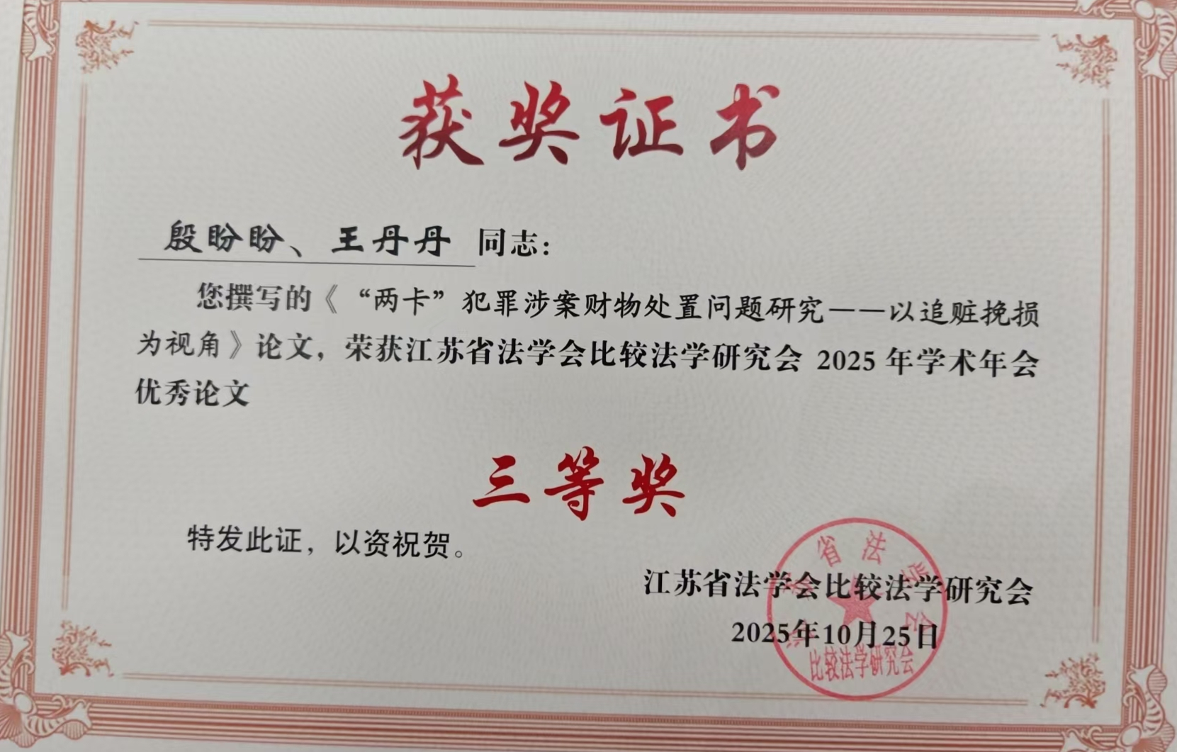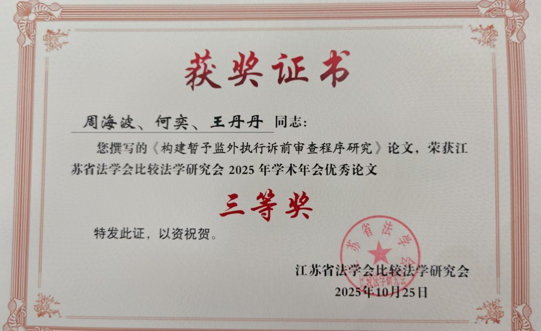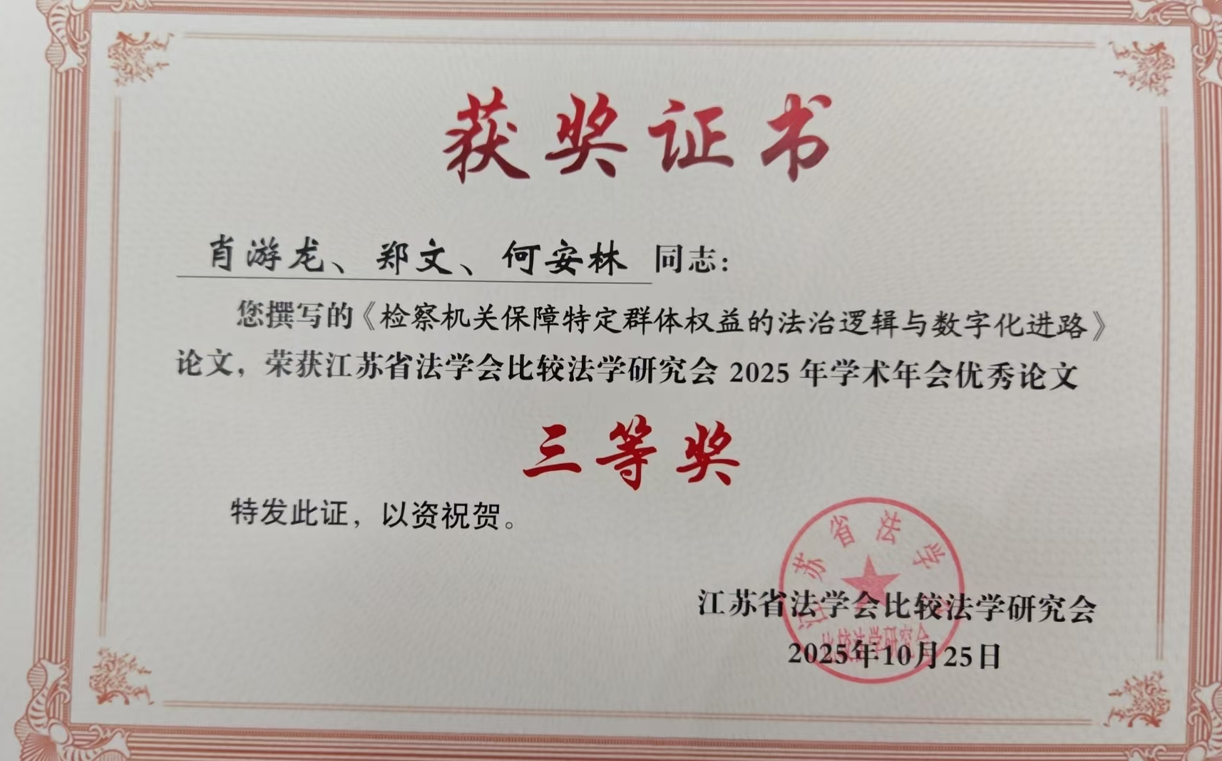 2025年10月25日,江苏省法学会比较法学研究会2025年年会在南京召开,金湖县检察院撰写报送的《构建暂予监外执行诉前审查程序研究》、《“两卡”犯罪涉案财物处置问题研究——以追赃挽损为视角》、《检察机关保障特定群体权益的法治逻辑与数字化进路》3篇论文获评优秀论文三等奖,并受邀参会。