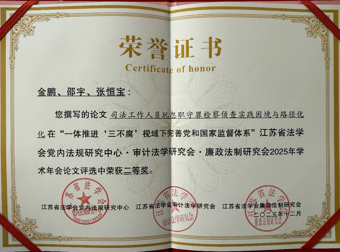 12月6日,江苏省法学会党内法规研究中心•审计法学研究会•廉政法制研究会2025年学术年会在南京成功举办,金湖县检察院报送的《司法工作人员玩忽职守罪检察侦查实践困境与路径优化》荣获二等奖。